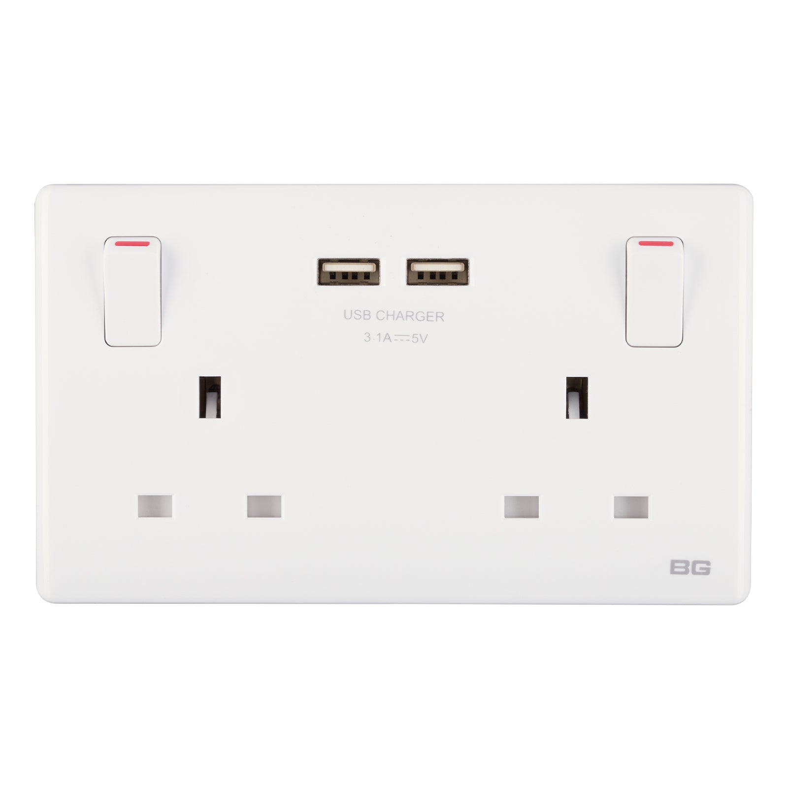 British General BG Neo Slimline Double Socket with USB-A Charger, White (PCWH22U3)