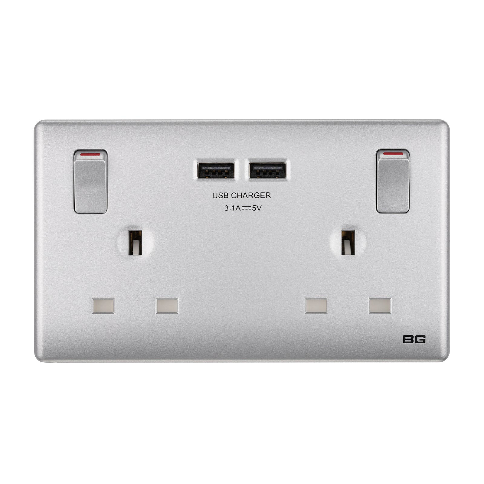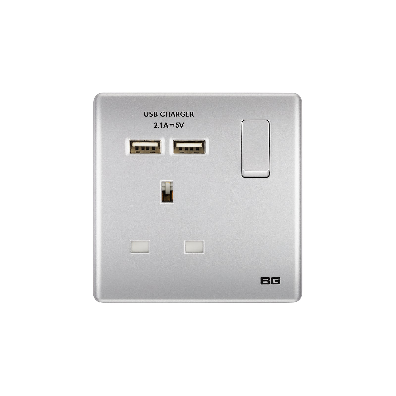 British General BG Neo Slimline Single Socket with USB Charger, Silver (PCSL21U2)