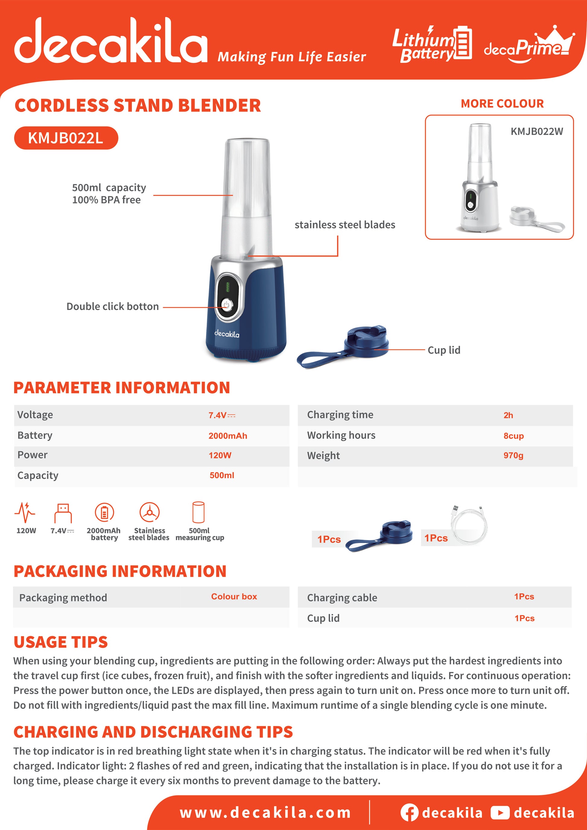 Decakila Cordless Stand Blender, 120W, 500ml (KMJB022L/W)