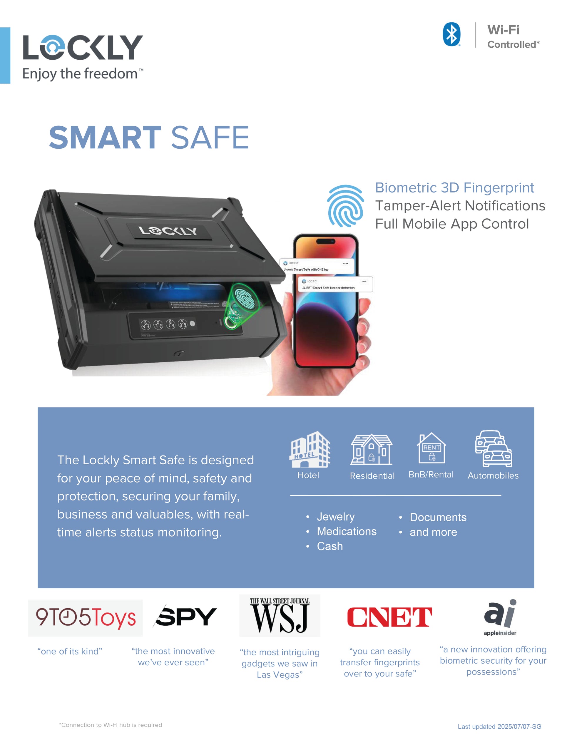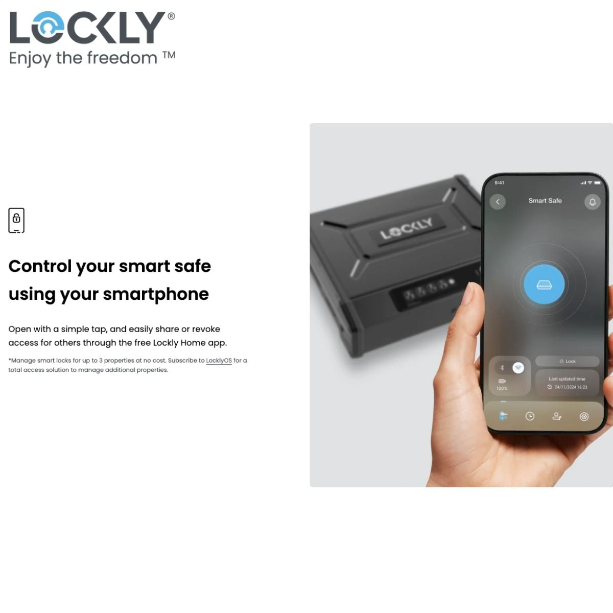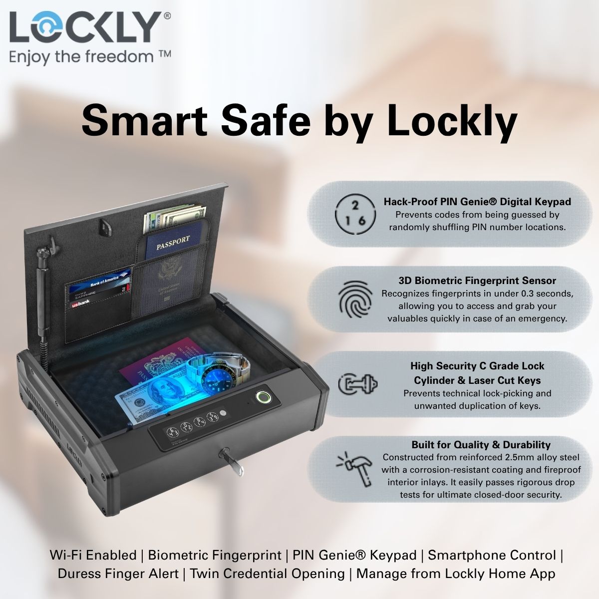 The Lockly Smart Safe is the ultimate security solution for your home, business, or rental property. With 3D biometric fingerprint recognition, Wi-Fi alerts, tamper-proof notifications, and full mobile app control, this safe ensures your valuables are always protected. Whether you need to secure cash, jewelry, medications, important documents, or firearms, the Lockly Smart Safe offers military-grade security with smart technology.