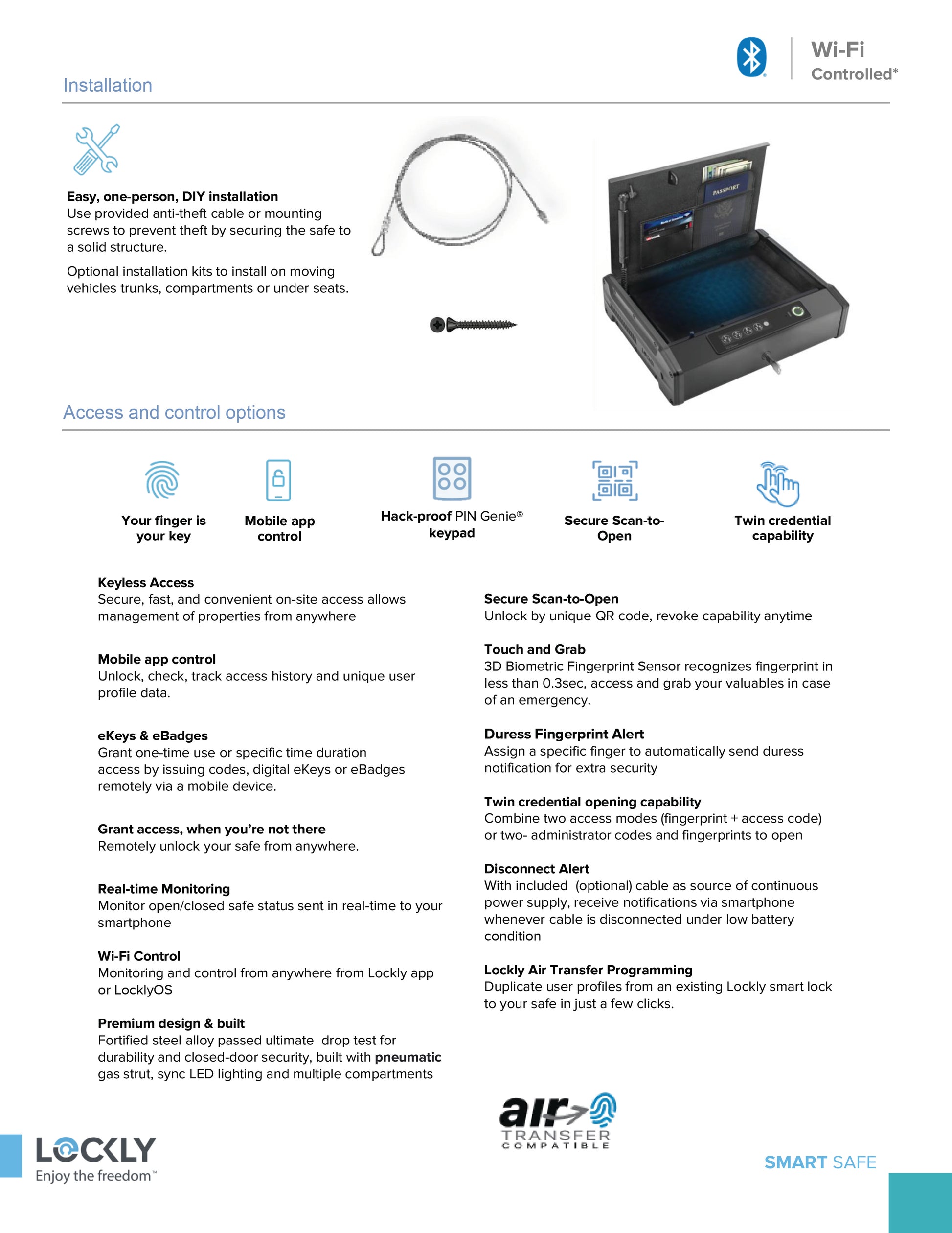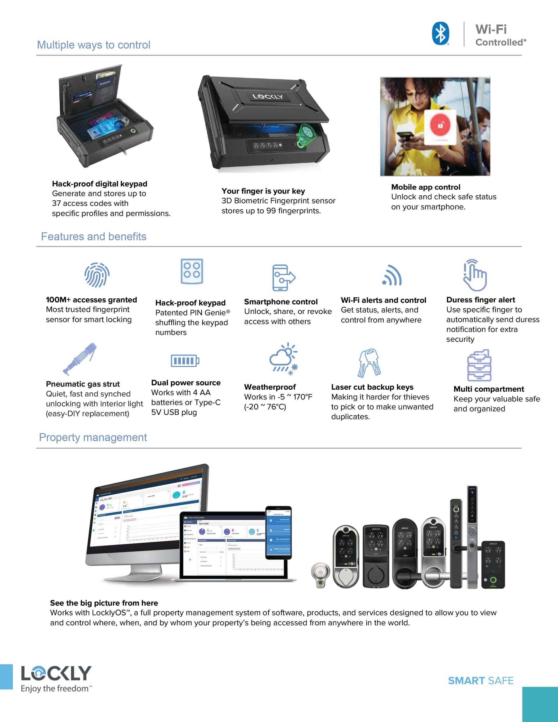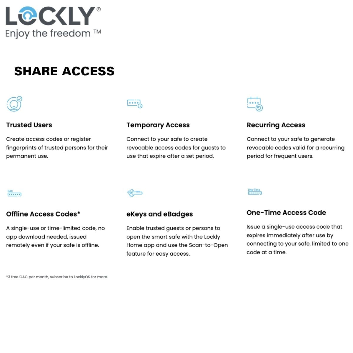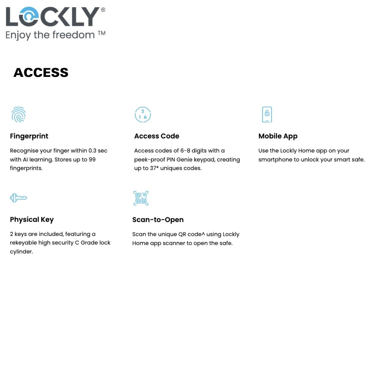 The Lockly Smart Safe is the ultimate security solution for your home, business, or rental property. With 3D biometric fingerprint recognition, Wi-Fi alerts, tamper-proof notifications, and full mobile app control, this safe ensures your valuables are always protected. Whether you need to secure cash, jewelry, medications, important documents, or firearms, the Lockly Smart Safe offers military-grade security with smart technology.
